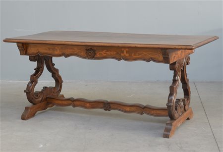 Tavolo da centro in noce. Fascia sagomata, intagliata e intarsiata a motivi vegetali e fregi. Sostegni a lira scolpiti a fregi e volute (cm 190x80x84)