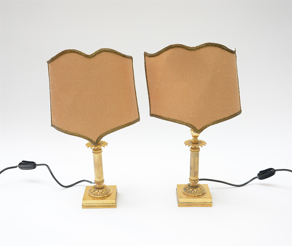 Coppia di abat jour in ottone a forma di candeliere con corpo scanalato (difetti)