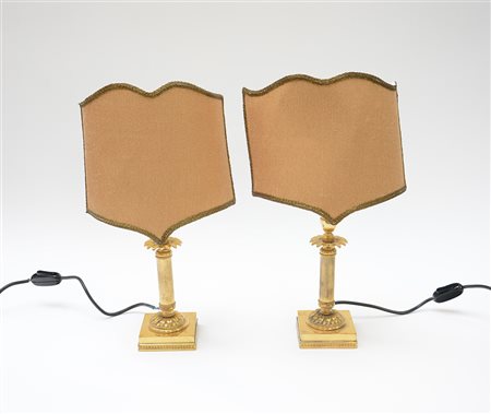 Coppia di abat jour in ottone a forma di candeliere con corpo scanalato...