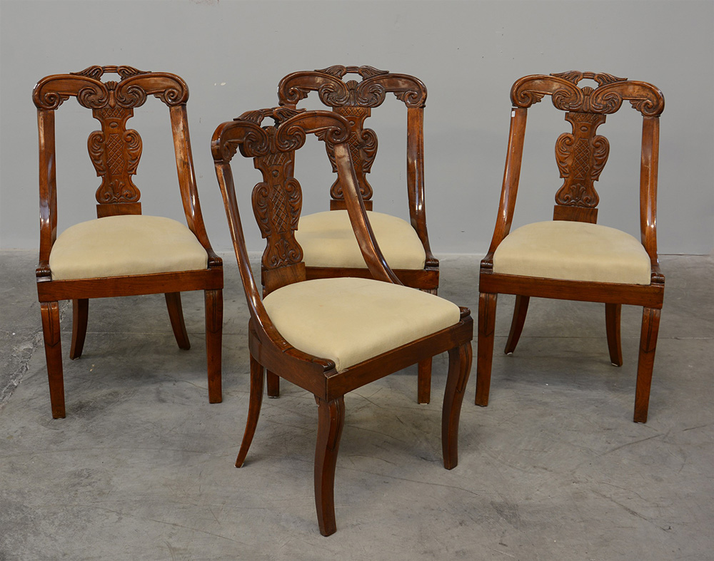 Gruppo di quattro sedie a gondola con schienale a giorno, cartella intagliata, gambe anteriori mosse, posteriori a sciabola (difetti)