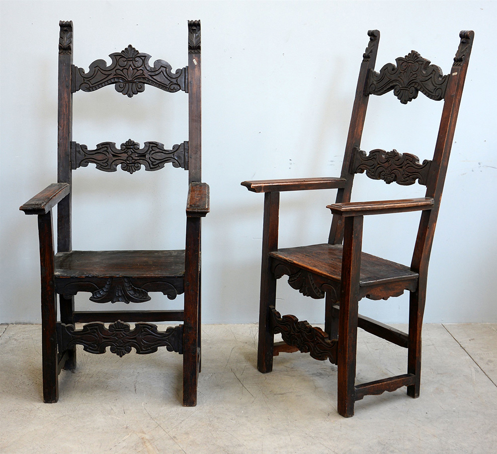 Coppia di seggioloni rinascimentali con schienale a giorno e cartelle sagomate e intalgiate. Piedi dritti. Inizio sec. XX (difetti)