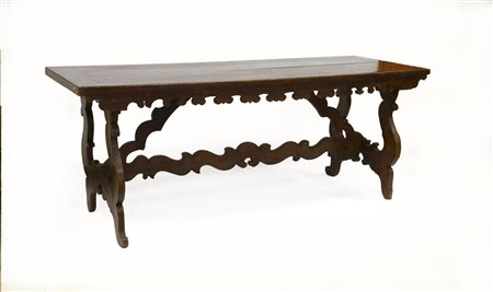 Antico tavolo di forma rettangolare. Gambe e traverse a lira, fasce decorate a volute (cm 207x82x80)