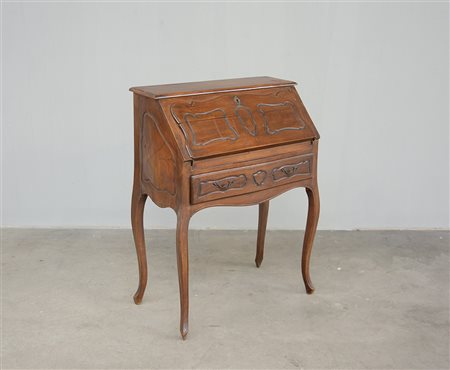 Scrittoio in noce con calzatoia celante cassettini e vani, un cassetto nella fascia, gambe mosse (cm 70x92x38) (difetti)