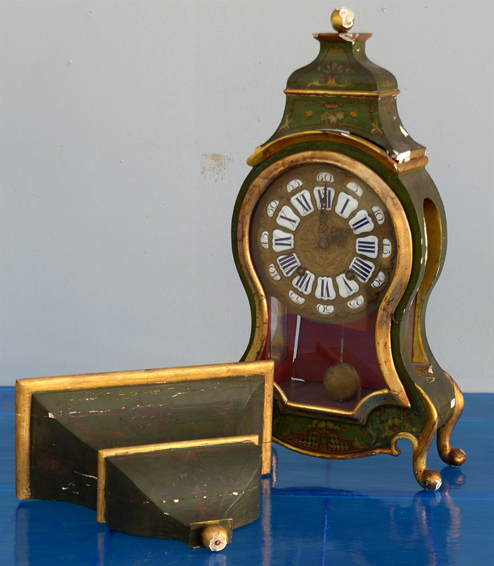 Pendola con mesola in legno laccato, movimento con carica a otto giorni, scappamento a verga, quadrante con cartuches con numeri romani (h cm 93 circa) (difetti e mancanze, mensola non pertinente)