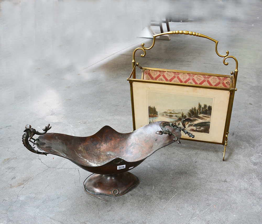 Lotto composto da un portariviste in ottone e un centrotavola biansato in rame (difetti)