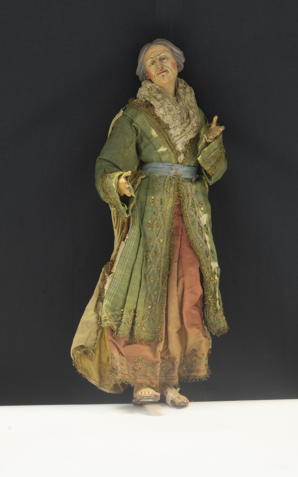Arte napoletana dell'inizio del secolo XIX "Donna anziana" scultura da presepe con testa, mani e piedi in terracotta dipinta, vestiti in stoffa coevi (h cm 44)(difetti e mancanze)