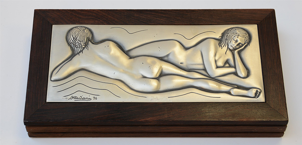Scatola portasigarette in legno con coperchio decorato con un altorilievo in argento 925 firmato Ottaviani e datato 1976