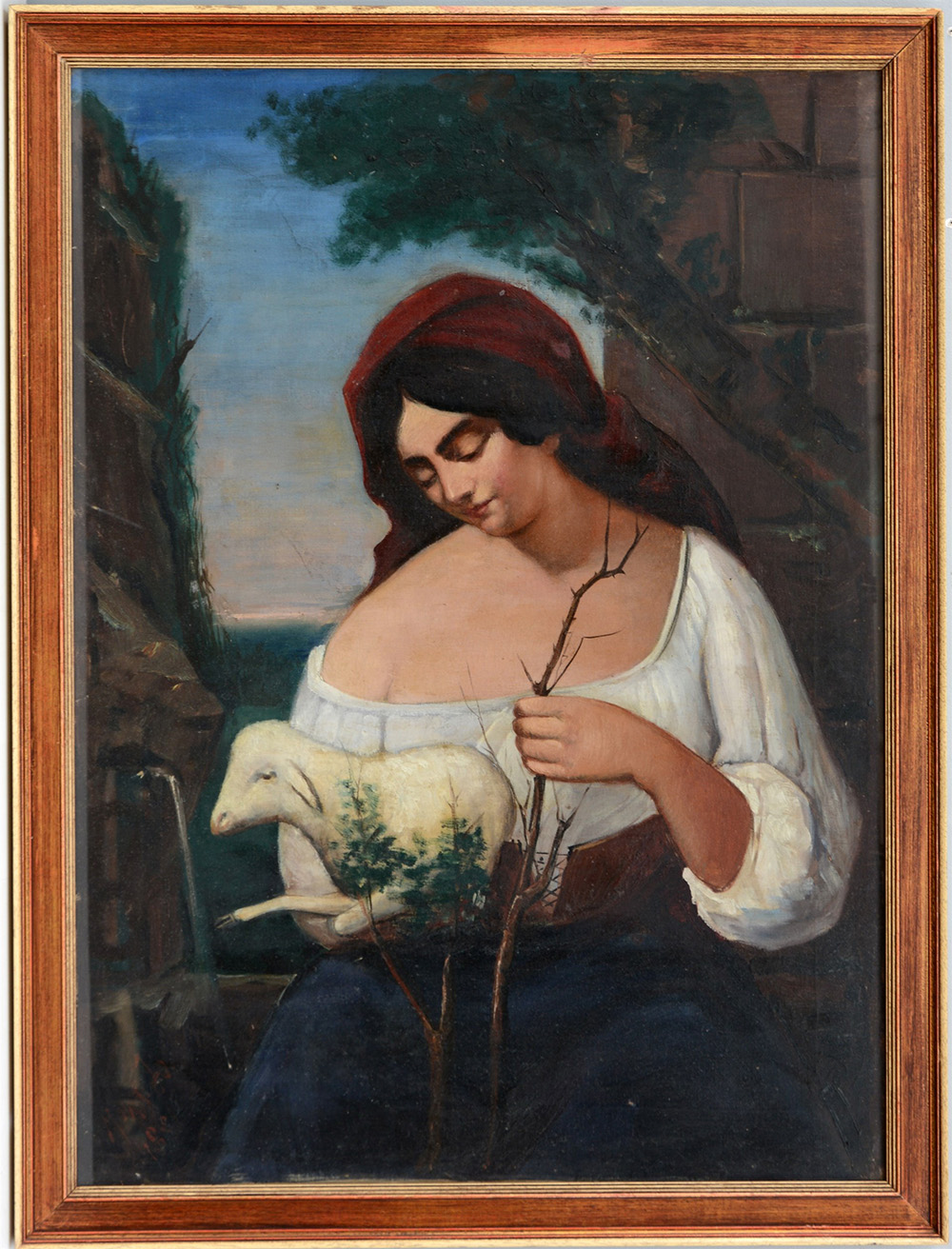 Firma indecifrata, "Contadina con agnello" 1881 olio su tela (cm 104x77) firmato e datato in basso a sinistra, in cornice (difetti)