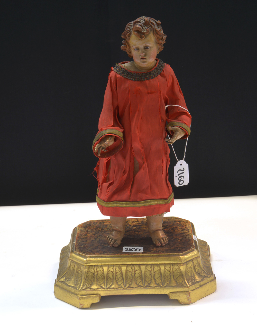 Arte napoletana dell'inizio del secolo XIX "Gesù Bambino" scultura da presepe con testa, mani e piedi in terracotta dipinta, occhi in vetro, vestito in stoffa coevo (h cm 32) poggiante su bSe in legno dorato, intagliato a palmette e laccato a finto marmo di epoca posteriore (difetti e mancanze)