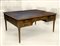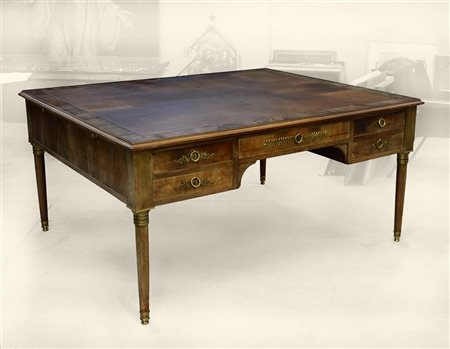 Scrivania da centro a quattro cassetti per fascia, sui lati lunghi, due pianetti per parte, estraibili sui lati corti. Guarnizioni stile "impero" in ottone dorato. Quattro gambe tornite con capitelli e piedini in ottone cesellato e dorato. Piano in marocchino impresso in oro con cornice in piuma di noce (cm 170x83x140) difetti