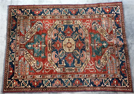 Tappeto Azeri, Caucaso, secolo XX. Disegno a medaglione ottagonale azzurro su...