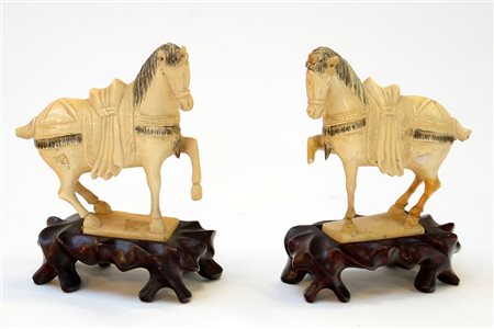 Coppia di sculture raffiguranti cavalli in osso su base in legno (h cm 12) (difetti e mancanze)