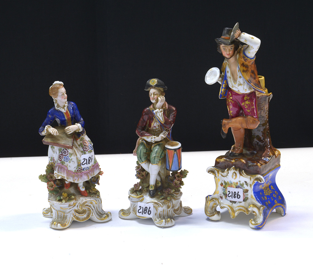 Lotto composto da una sculturina di manifattura francese del secolo XIX e una coppia di manifattura diversa, in porcellana policroma raffiguranti suonatori, misure diverse (difetti e mancanze)