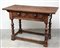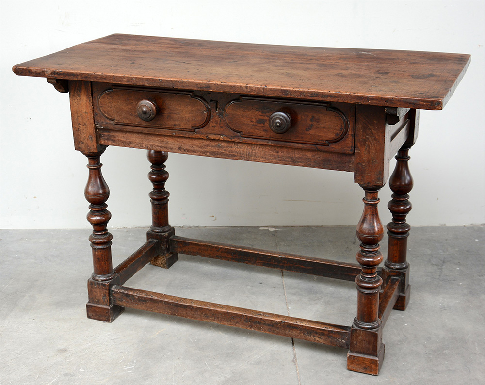 Antico tavolo rettangolare con gambe tornite su basi a plinto riunite da traverse, cassetto nella fascia con pomoli in legno su bugne (cm 122x82x61) (difetti)