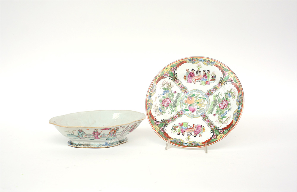 Piatto in porcellana Famiglia Rosa cantonese con marchio apocrifo Qianlong alla base e alzata in porcellana Famiglia Rosa con figure. Cina, sec. XX