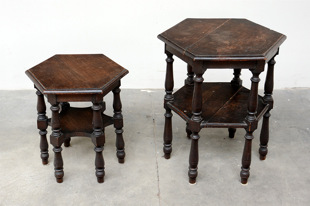 Lotto di due tavolini esagonali in legno a due ripiani con gambe tornite e raccordi a dado, dimensioni differenti (difetti)
