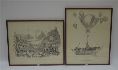 Gatti-Dura, coppia di incisioni in bianco e nero intitolate "Permanenza nella luna e diligenza per la luna" datate 1836. In cornici