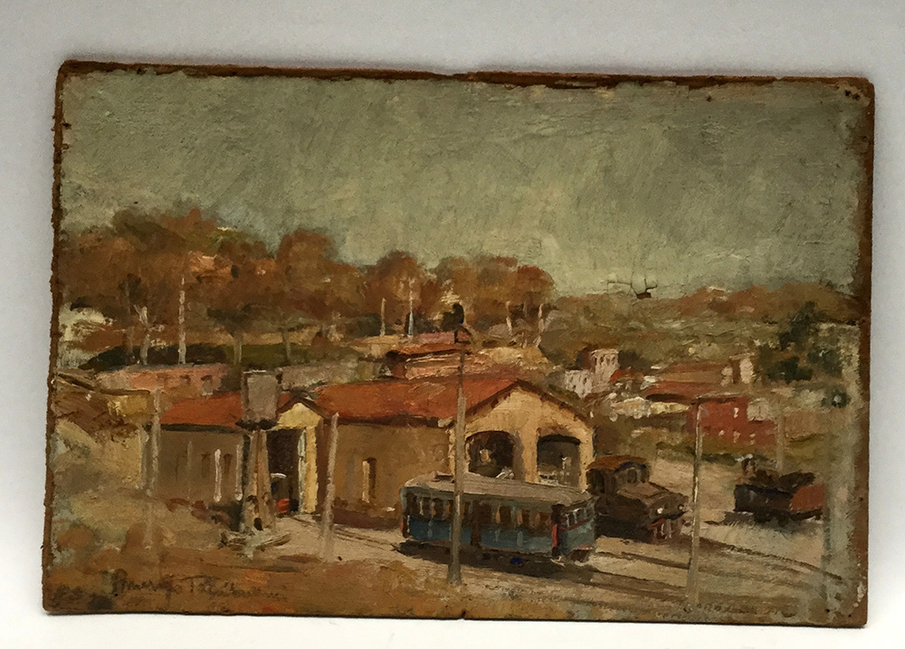 Amerigo Tamburrini (Napoli 1901-1966) "Scorcio di città con tram" olio su cartone pressato (cm 20x30) firmato in basso a sinistra (difetti)