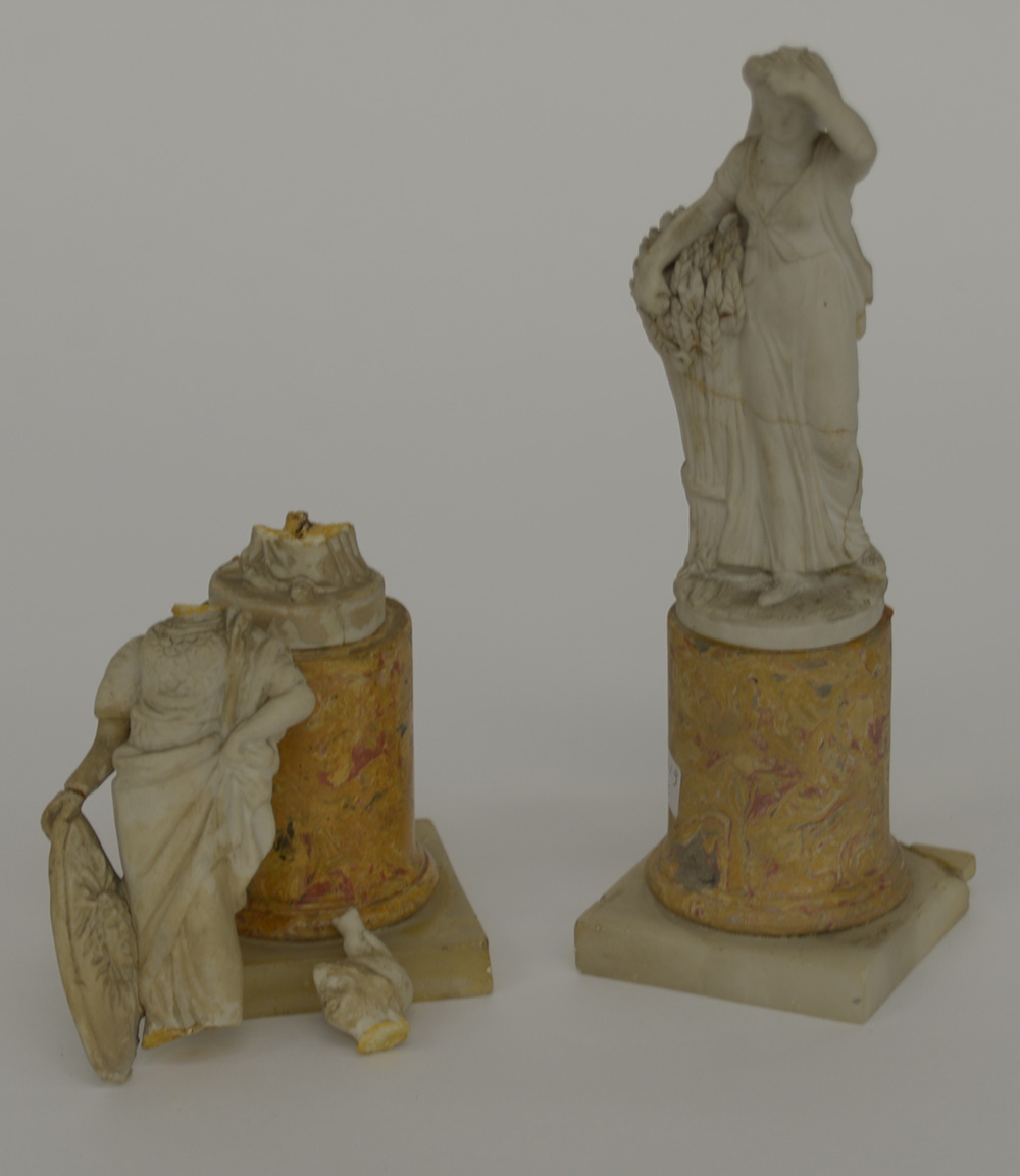 Arte del sec. XIX "Figure classiche" coppia di sculture in biscuit poggianti su base a plinto in marmo e alabastro (h. cm 24) (difetti e restauri)