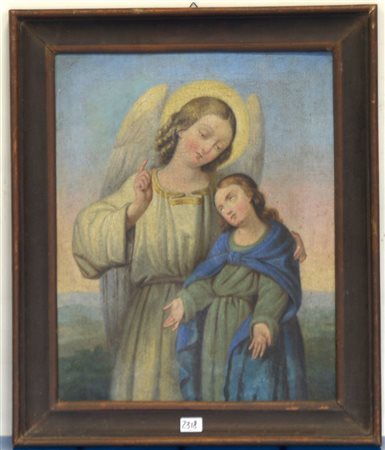Scuola del sec. XIX "Angelo con fanciullo" olio su tela (cm 46x36) in cornice (difetti)