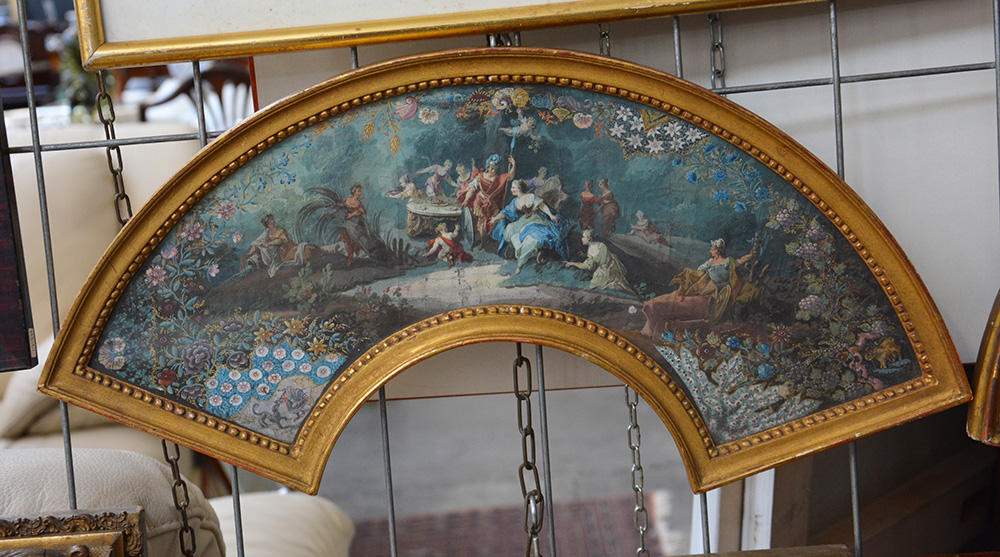 Scuola del secolo XVIII "Scena mitologica in un paesaggio e al recto paesaggio con animali e fiori" studio per ventaglio ad acquarello su carta sagomata (cm 46x13) In cornice (difetti)