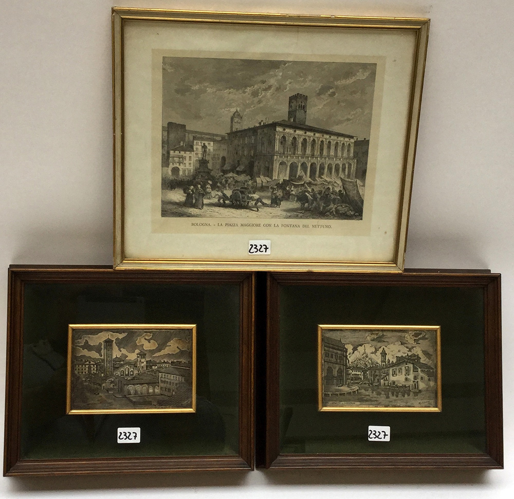 Coppia di incisioni su lamina d’argento raffiguranti scorci milanesi, cui si unisce un’incisione su carta con uno scorcio di Bologna (difetti)