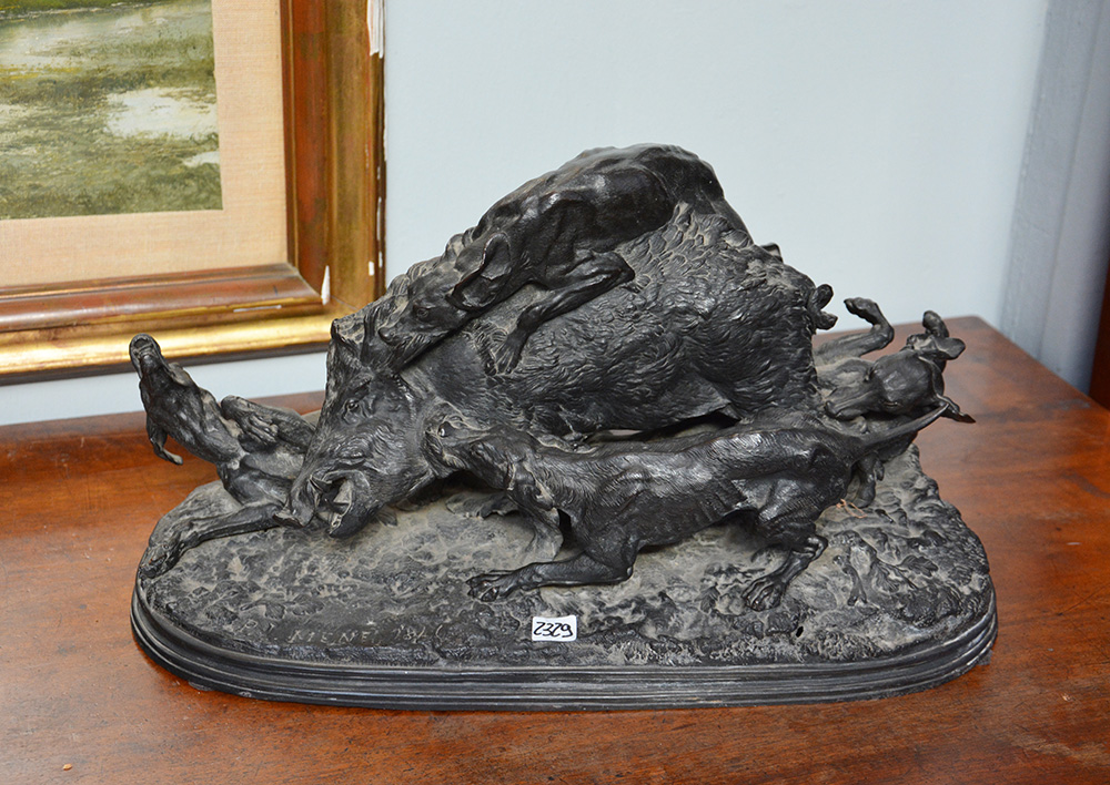 Ignoto "Assalto al cinghiale" scultura in metallo (cm 48x28x22) Reca firma e datata 1846 alla base (lievi difetti)
