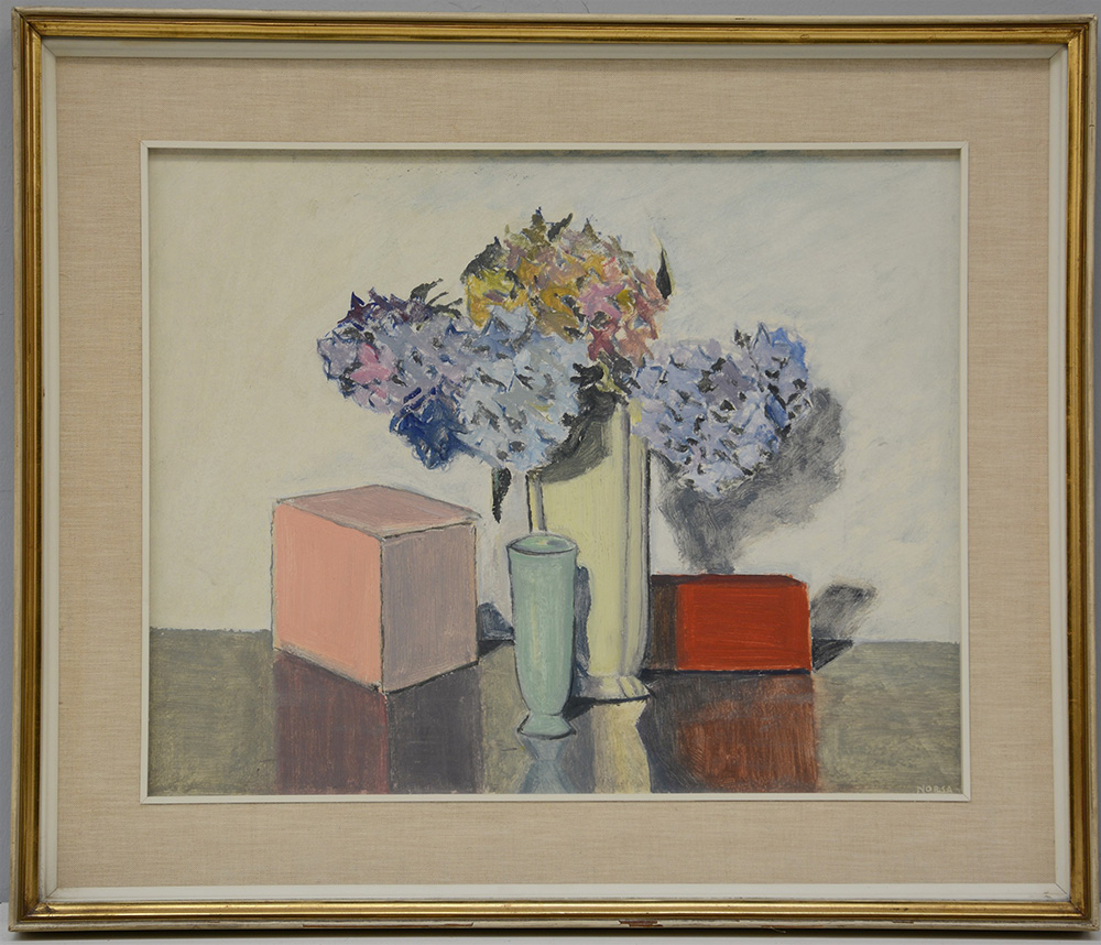 Norsa “Natura morta con vasi, fiori e figure geometriche” olio su cartone (cm...