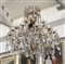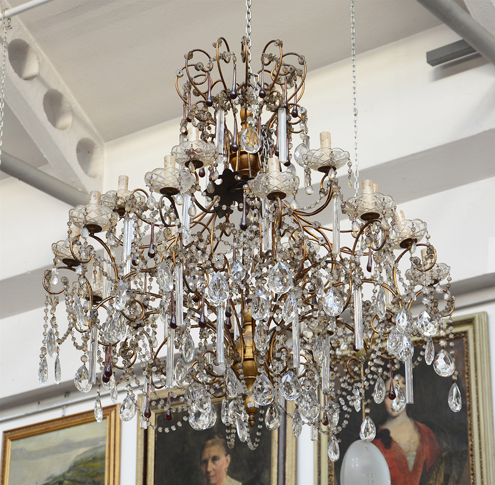 Grande lampadario a diciotto luci con fusto in legno dorato e braccia in metallo decorato con gocce, pendagli e perline in cristallo (difetti e mancanze)
