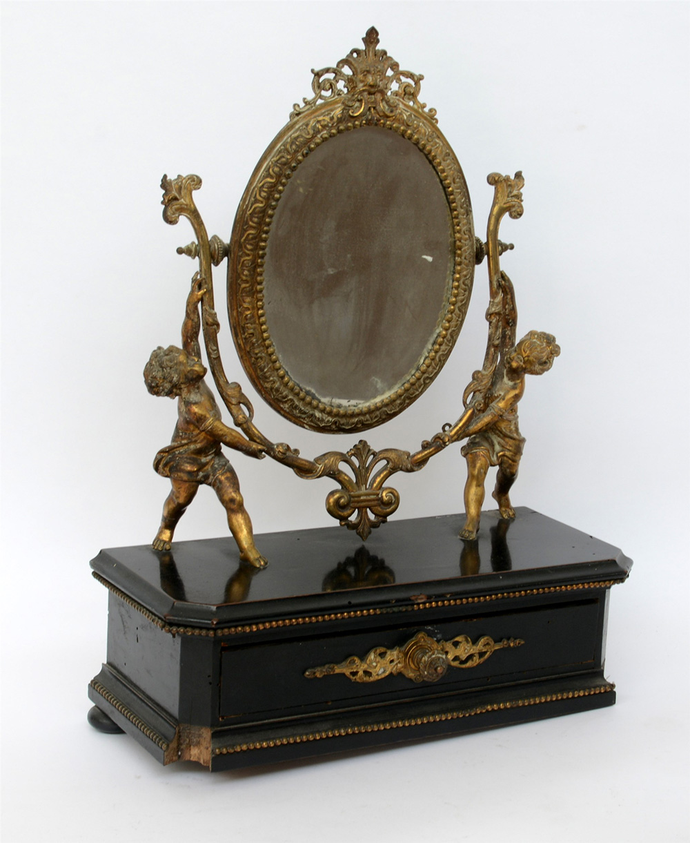 Psiche da tavolo in legno ebanizzato con cassetto sormontato da specchio basculante in bronzo retto da amorini (h cm 33x44x14) (difetti e mancanze)