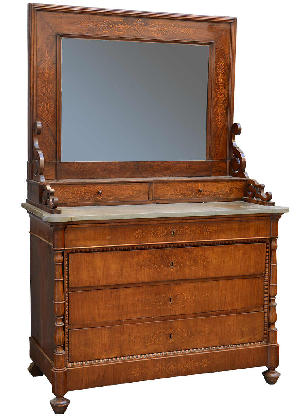 Comò con alzata a specchio a due cassetti e montanti intagliati e traforati. Fronte a due cassetti e mezzo con colonne e piedi torniti. Piano in marmo sagomato. Sec. XIX (130x193x64) (difetti)