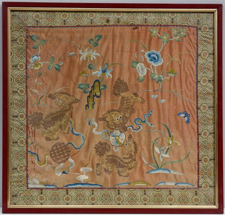 Ricamo in seta policroma su raso di seta color albicocca, Cina , fine secolo...