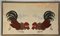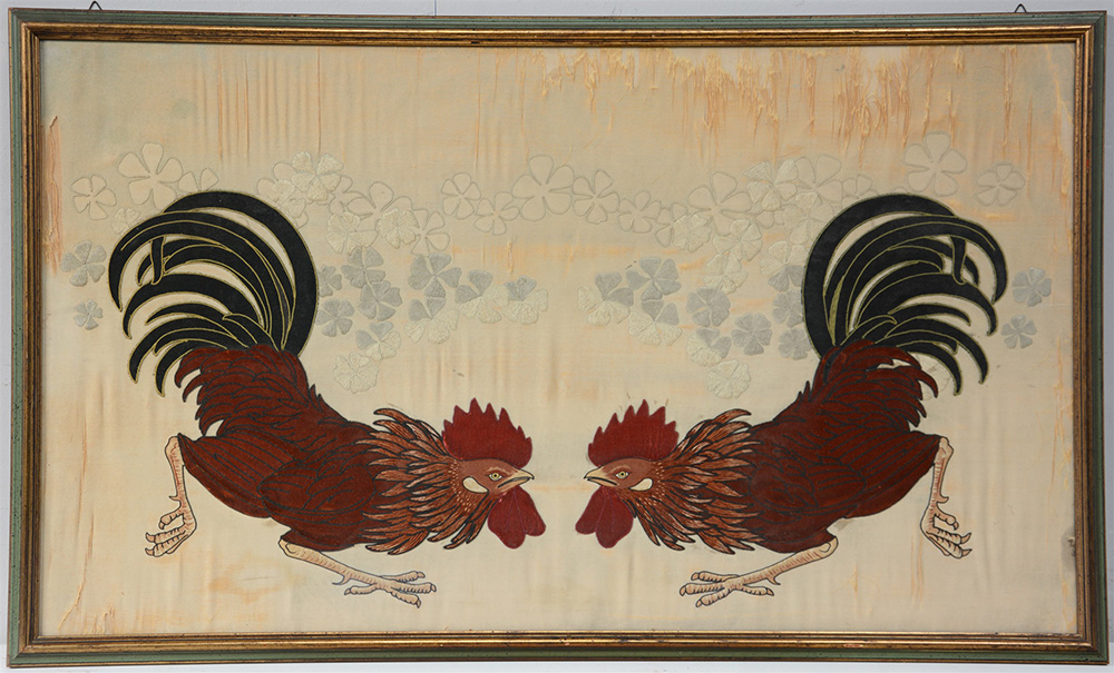 Con applicazioni in panno di lana raffigurante due galli in battaglia, in cornice (cm 54x93) (difetti)