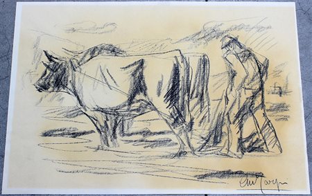 "L'aratura" disegno a carboncino su carta (mm 380x555) Firmato in basso a destra (difetti)