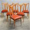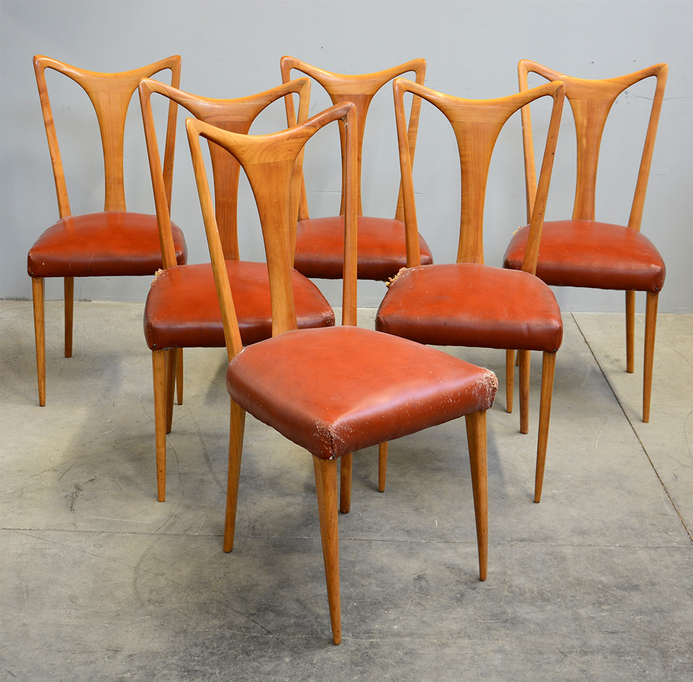Gruppo di sei sedie con schienale a giorno sagomato, gambe tornite e seduta in similpelle rossa. Italia, anni '50. (cm 46x197x46) (difetti)