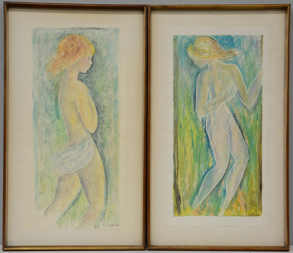 E. Ricetti Coppia di tecniche miste raffiguranti fanciulle svestite (cm 62x31...