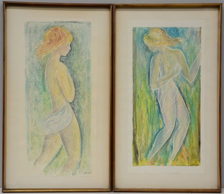 Coppia di tecniche miste raffiguranti fanciulle svestite (cm 62x31 circa) firmate in basso a destra, in cornice