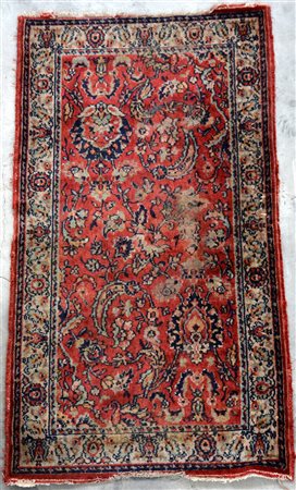 Tappeto meccanico, inizio secolo XX. Disegno orientale su fondo rosso. (cm...