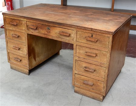 Scrivania in legno a nove cassetti con maniglie ricurve, anni ’40 del secolo XX (cm 140x80x80)(difetti)
