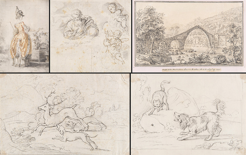 Lotto composto da cinque frai disegni e tecniche miste dei secoli XVIII e XIX (difetti)