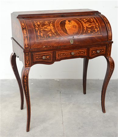 Scrittoio da centro a rullo intarsiato a figure e motivi vegetali, tre cassetti nella fascia con gambe mosse e calatoia celante quattro cassetini e vano a giorno, secolo XX (cm 87x101x52) (difetti)