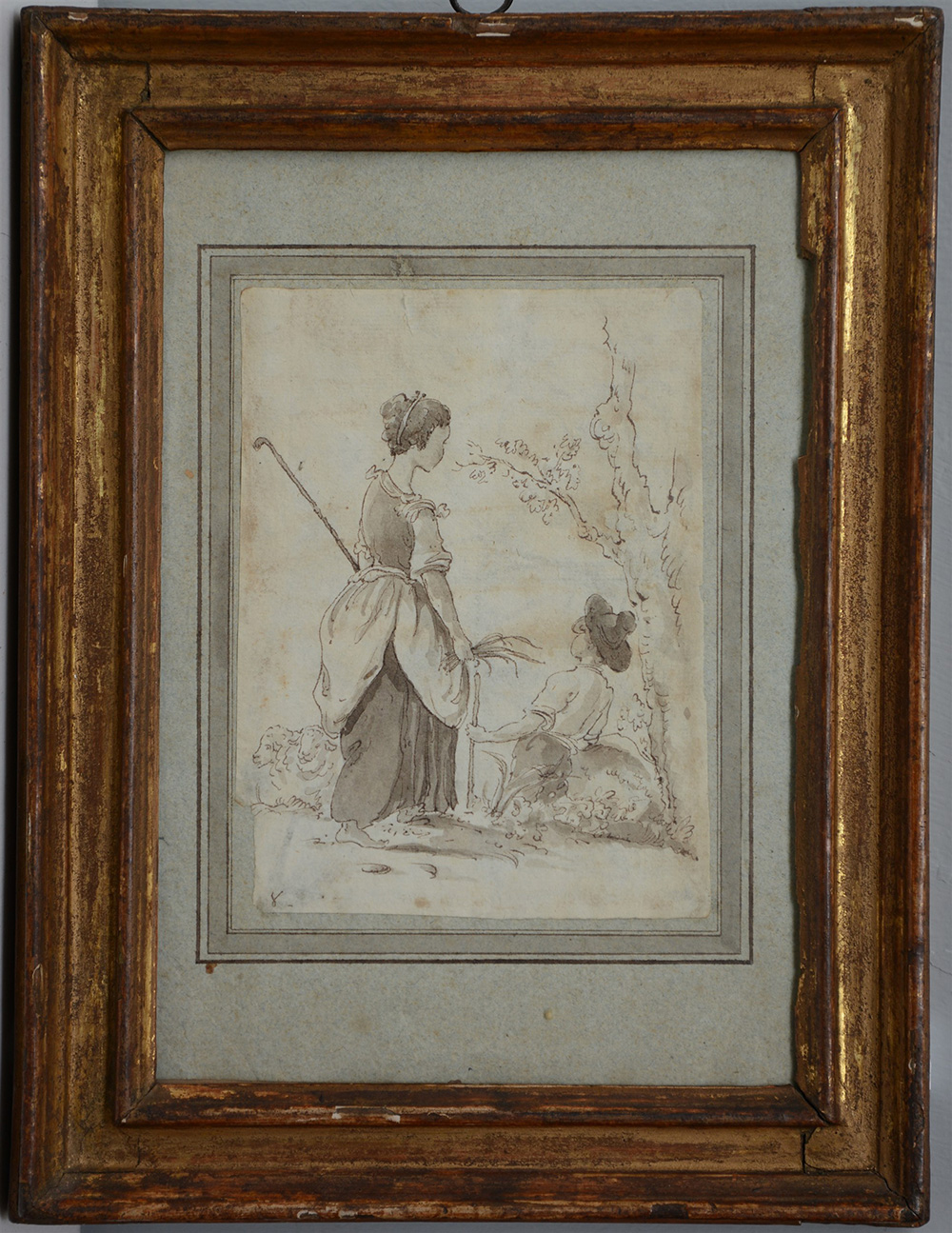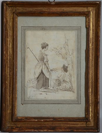 Scuola del secolo XVIII "Pastorelli" penna e inchiostro bruno acquerellato in bruno (mm 180x130) in cornice del secolo XVIII (difetti)