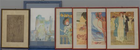 Lotto composto da un acquarello raffigurante paesaggio, quattro riproduzioni di manifesti dell'inizio del secolo XX ed una riproduzione di un disegno antico, in cornici (difetti)