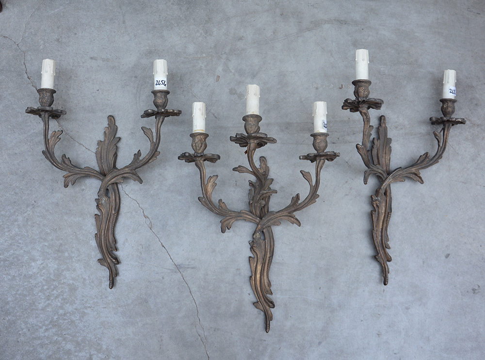 Lotto composto da una coppia di appliques a due fiamme e una applique a tre fiamme in bronzo cesellato a motivi vegetali (difetti)