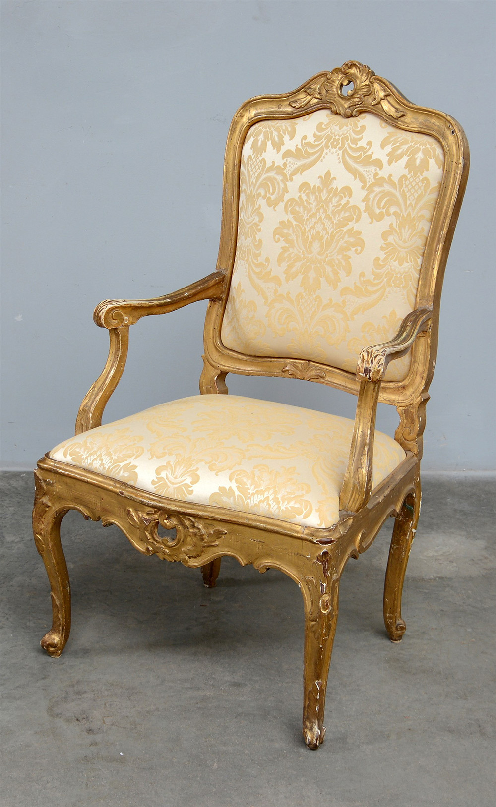 Poltrona in legno dorato e intagliato con schienale e fasce traforate, secolo XIX (difetti)