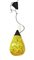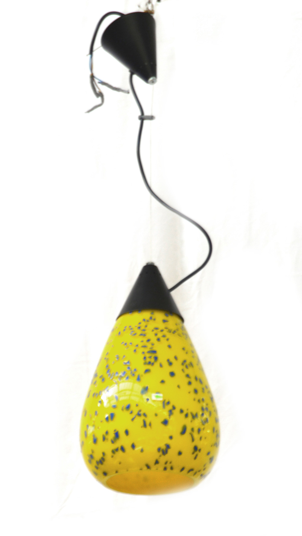 Lampadario in vetro incamiciato giallo a macchie blu con struttura in metallo verniciato nero. Manifattura Murano, anni '90.