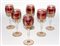 Manifattura di Boemia, sei bicchieri da liquore in cristallo con coppa ad elementi rossi e rilievi dorati