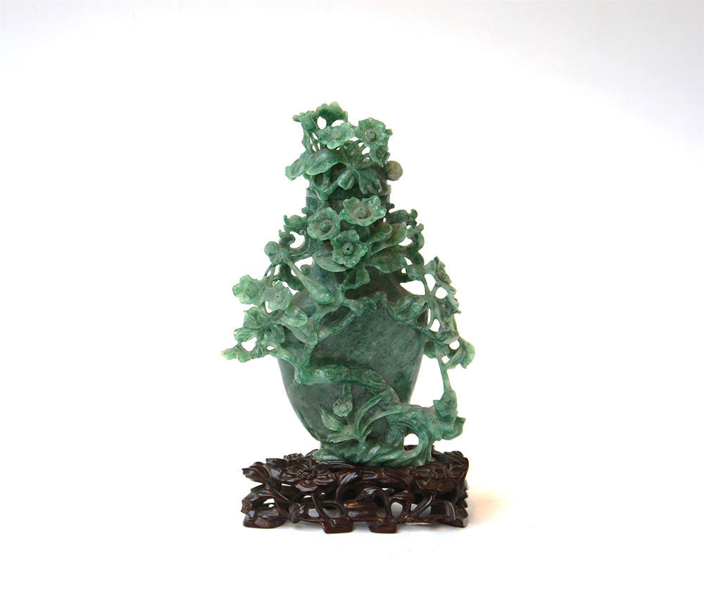 Vaso con coperchio in pietra dura verde decorato con rami in fiore e uccelli, base intagliata in legno (difetti e restauri)