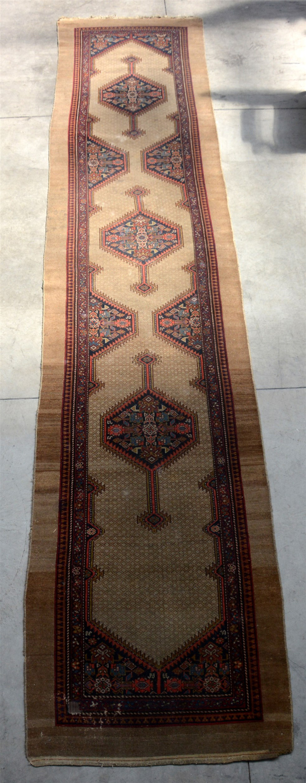 Disegno a medaglioni romboidali policromi su fondo beige, decorato con griglia in lana di cammello. Bordura esterna in lana di cammello naturale a tinta unita. (cm 495x105) (difetti)