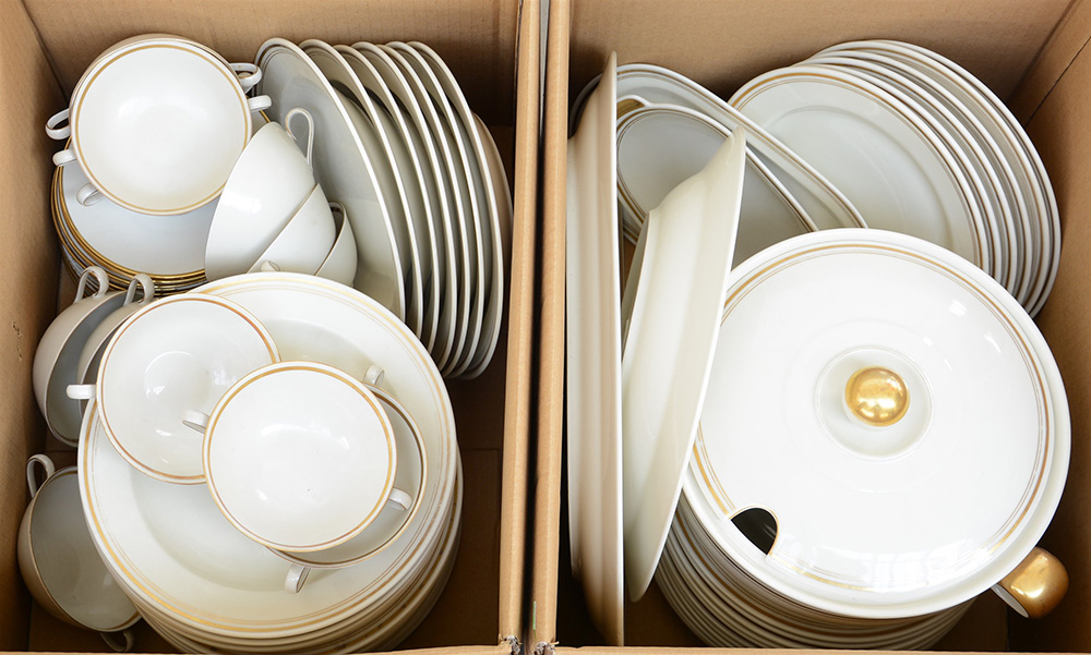 Manifattura tedesca, servizio da tavola in porcellana con profili dorati composto da dodici piatti fondi e trentadue piani, dodici tazze da brodo con piattini, due piatti da portata ovali e uno tondo, una raviera e una zuppiera (in due cartoni)(difetti)